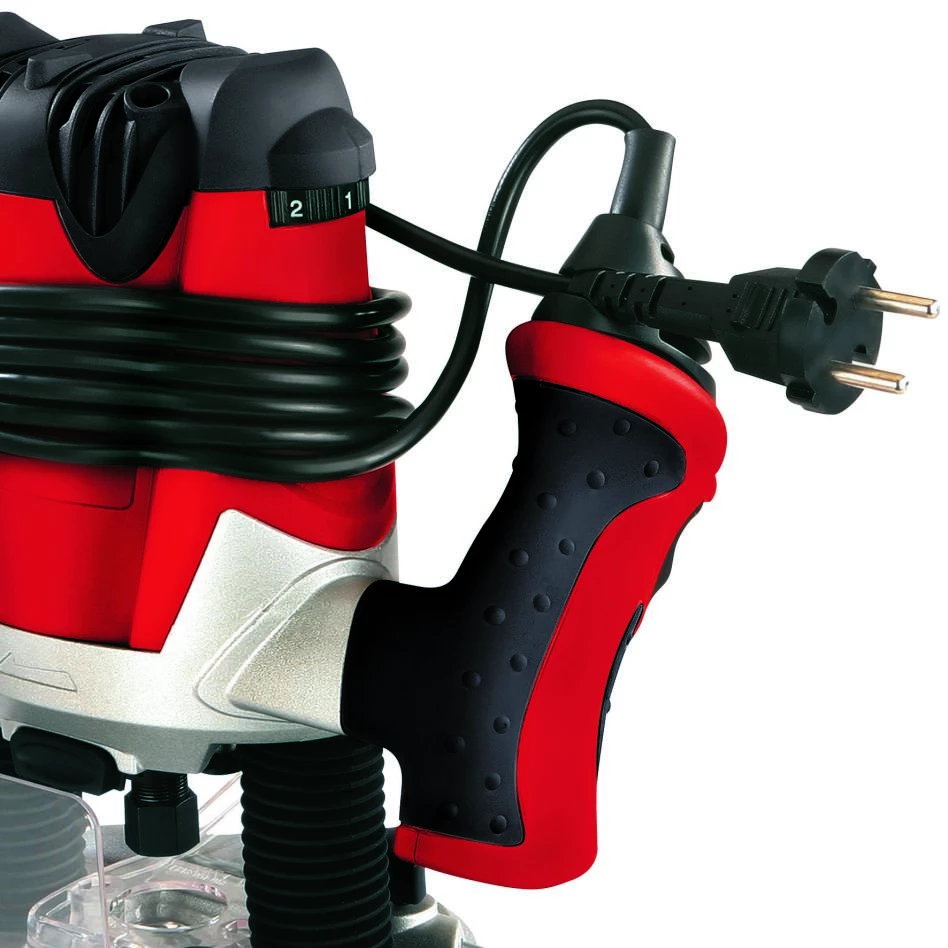 De Einhell TE-RO 1255 E is een krachtige Routeur, die je in staat stelt om de meest veeleisende freeswerkzaamheden op een nauwkeurige manier uit te voeren. De machine kan onder meer gebruikt worden in combinatie met massief hout, multiplex en vezelplaten in huis, garage of op een werkplaats. Een vooraf in te stellen freesdiepte bevordert een nauwkeurige manier van werken met deze bovenfrees. Daarbij kan de afstelling van deze machine met de fijninstelling verder worden geoptimaliseerd. Deze bovenfrees is voorzien van een krachtige 1200 W motor, die het mogelijk maakt om de meest uiteenlopende freeswerkzaamheden op een nauwkeurige wijze uit te voeren. Voorafgaand aan de freeswerkzaamheden is het met de geïntegreerde regelelektronica mogelijk om het toerental in te stellen, zodat deze aansluit bij het materiaal waarmee je werkt tijdens een klus. Om een nauwkeurige manier van werken te bevorderen kun je de freesdiepte gemakkelijk instellen via de traploze revolveraanslag. De asvergrendeling op de machine maakt een snelle, moeiteloze wissel van de freesplaat mogelijk om snel weer aan de slag te kunnen gaan. Door het evenwichtige ontwerp van de machine blijft deze in een veilige stand staan tijdens het wisselen van de freesplaat. Ook de spantang zorgt voor flexibiliteit, doordat de spantang de inzet van freesplaten met een schachtdiameter van 6 tot 8 mm mogelijk maakt. Een kunststof tussenlaag aan de standvoet van de machine, ontziet het oppervlak van het werkstuk waarmee word gewerkt. Daarbij zorgt een spaanscherm op de machine voor een veilige manier van werken tijdens verschillende freeswerkzaamheden. Met de ergonomisch vormgegeven softgrip handgreep, ligt de bovenfrees zeer comfortabel in de hand tijdens het uitvoeren van freeswerkzaamheden. Daarbij absorbeert de softgrip handgreep een deel van de trillingen van de freesmachine. Wanneer de werkzaamheden zijn afgerond, kan je de kabel opwikkelen en aan de kabelclip op de machine bevestigen. Zo is de machine in een handomdraai weer netjes opgeborgen. Standaard worden een kompaspunt, parallel aanslag en kopieerhuls met de bovenfrees meegeleverd. Zo heb je alle benodigdheden om direct aan de slag te kunnen gaan met deze bovenfrees.