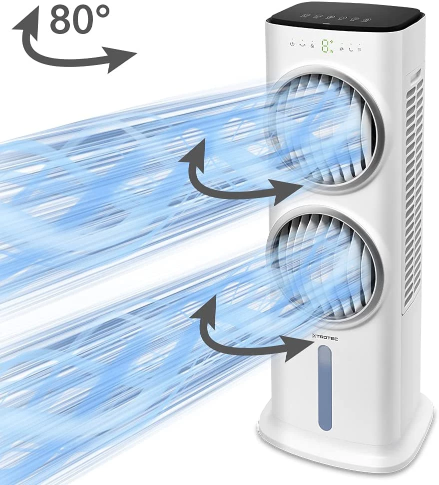 - Au lieu de ranger le refroidisseur d’air mince et peu encombrant dans le local de stockage après la saison estivale, nous vous recommandons de l’utiliser toute l’année. Au printemps et à la fin de l’été, vous pouvez fournir de l’air frais grâce à ses 5 réglages de ventilation et profiter de l’effet rafraîchissant de l’évaporation du froid.