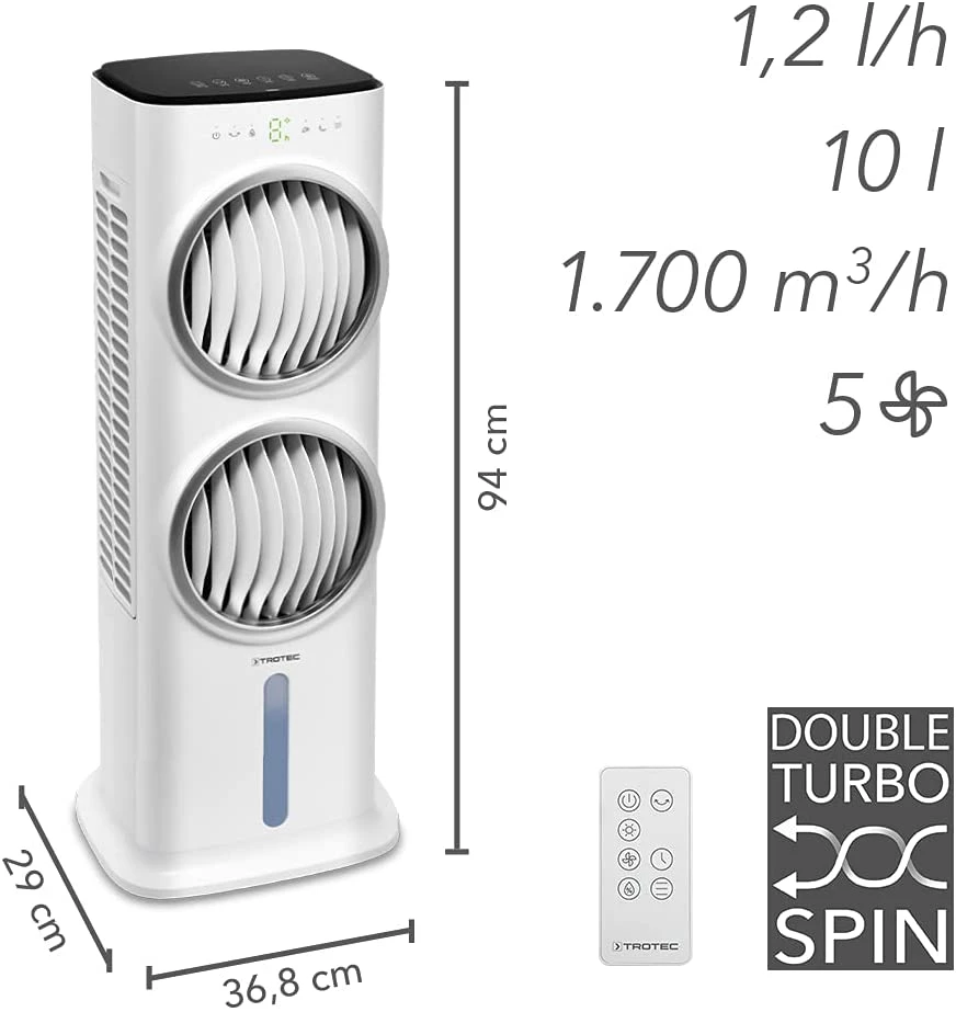 - Le rafraîchisseur d’air moderne PAE 45 avec télécommande infrarouge combat les températures chaudes de l’été grâce aux courants d’air glacés et rafraîchissants de deux puissants ventilateurs avec technologie turbo spin et une portée de 15 mètres.