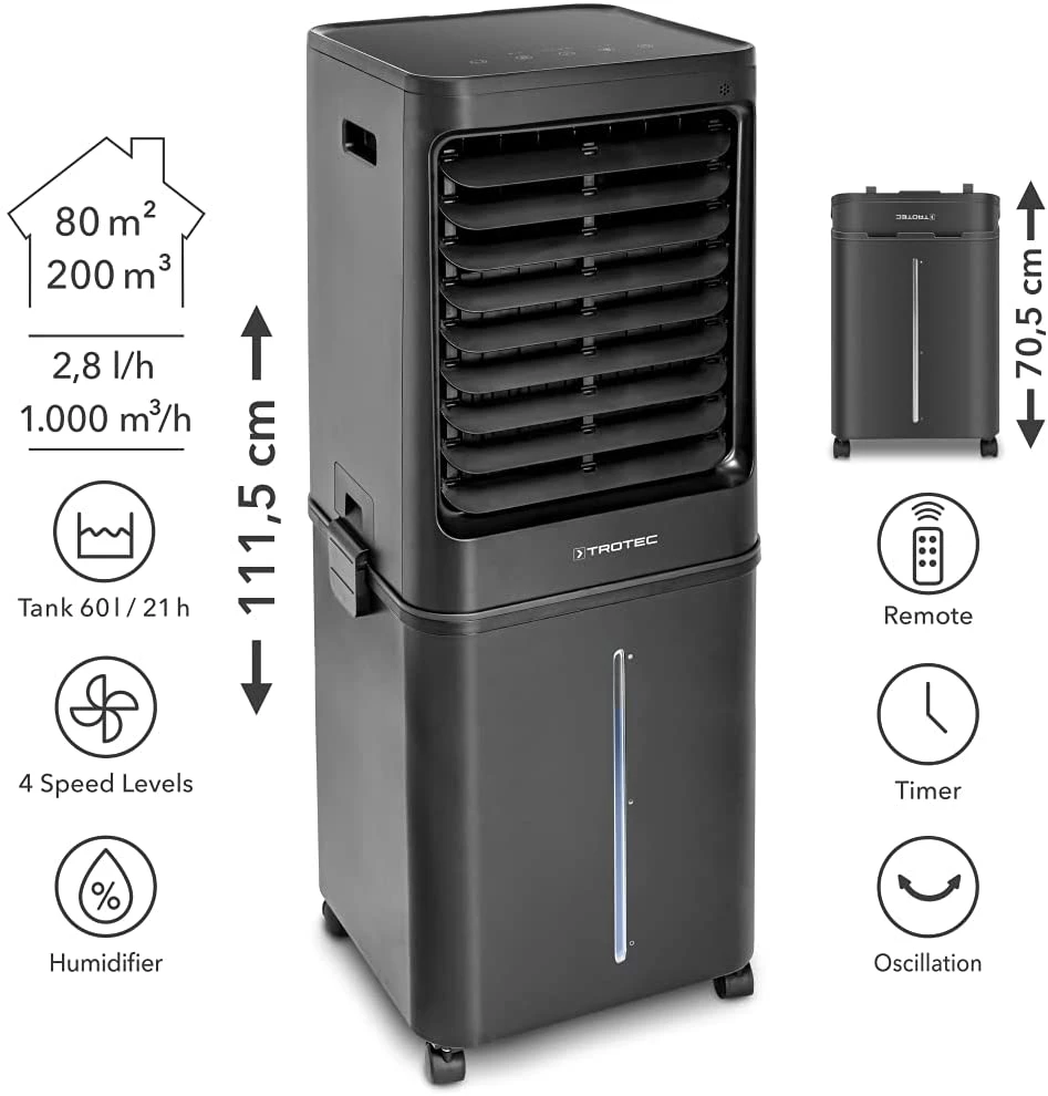 - Le refroidisseur d’air PAE 80, équipé d’une télécommande pratique, offre une brise fraîche et un refroidissement rapide dans la chaleur de l’été.