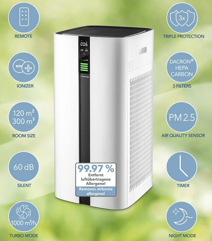- Entièrement automatique ! Grâce à sa purification de l’air intelligemment contrôlée et à son filtre HEPA à double action, l’appareil fournit un air hygiéniquement parfait pour une inhalation saine et une respiration profonde dans des pièces allant jusqu’à 120 m² ou 300 m³.