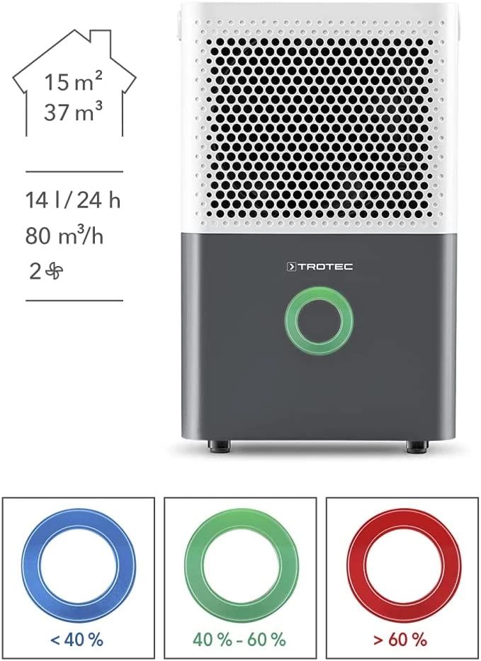 - Avec une capacité de déshumidification allant jusqu’à 14 l / 24 h et un réservoir d’eau de 1,5 l avec protection contre le débordement, le TTK 33 E, qui respecte l’espace vital, est recommandé pour maintenir au sec les pièces de taille moyenne jusqu’à 15 m² ou 37 m³.