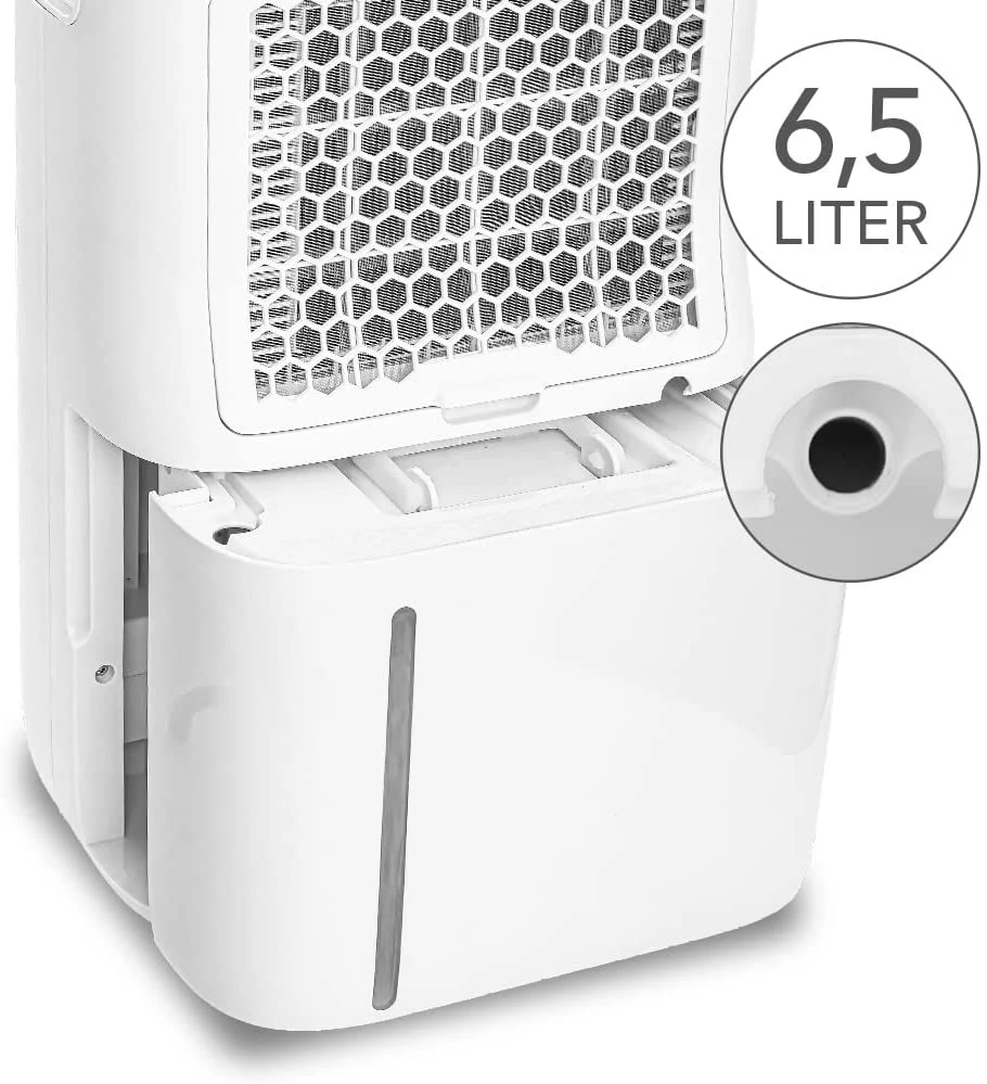- Pour un fonctionnement continu sans surveillance, le déshumidificateur, qui est équipé d’un réservoir d’eau de 6,5 litres, dispose d’une protection sûre contre les débordements qui éteint automatiquement l’appareil lorsque la capacité maximale du réservoir d’eau est atteinte.