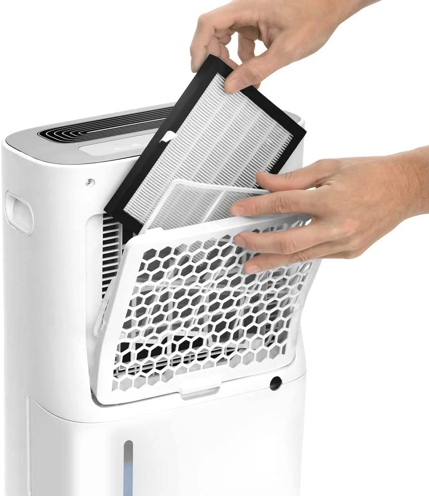 - Gecombineerde luchtontvochtiger met HEPA-luchtreiniger (95% effectieve HEPA-filtratie van bacteriën, virussen, pollen, fijnstof, huisstofmijten, schimmelsporen en andere allergenen en verontreinigende stoffen)