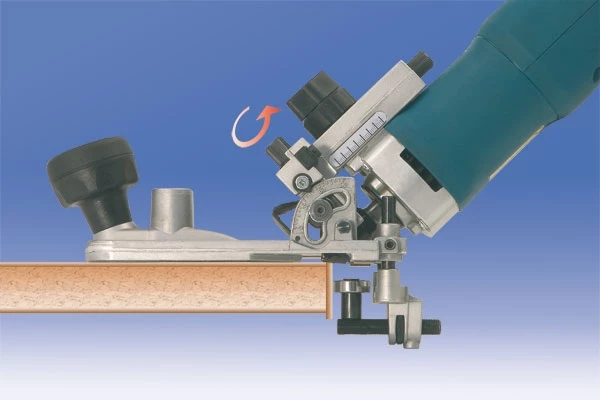 - Le corps de la machine peut être incliné à environ 46,5° de manière à ce que le côté de la fraise soit à 1,5° de la surface, ce qui permet d’éviter les dommages lors du défonçage des bords.